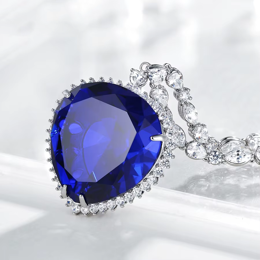 Crafted with high-quality rhodium plating and premium cubic zirconia, the Heart of the Ocean pendant reflects light brilliantly, creating a luxurious and eye-catching statement. Its bold size and classic heart silhouette make it perfect for special occasions, collectors, and fans of iconic movie jewelry.